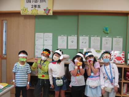 図画工作「わっかでへんしん」のへんしんグッズが完成しました。作ったへんしんグッズを身に付けて、みんなで写真をとったり、学校内を回ったりしました。先生方や他の学年の友達からたくさん褒めてもらい、喜んでいました。