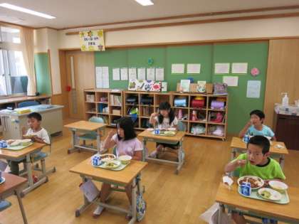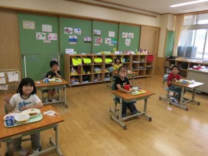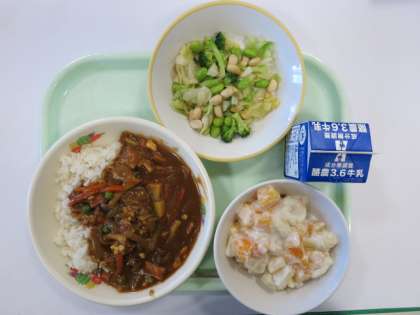 今日の献立は、むぎご飯、たべキリンハヤシ、まめまめサラダ、フルーツヨーグルト、です。