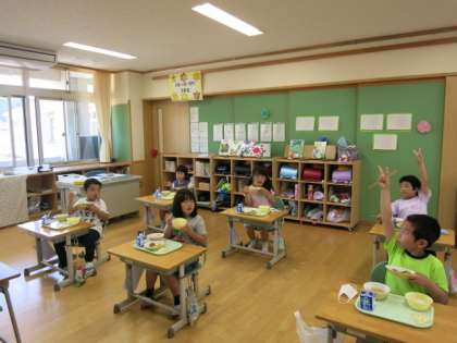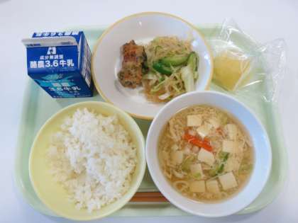 今日の献立は、ちくわの南部揚げ、はるさめサラダ、かきたま汁、れいとうリンゴ、です。