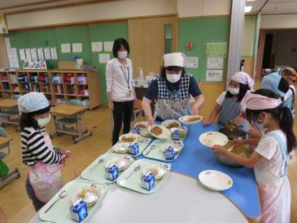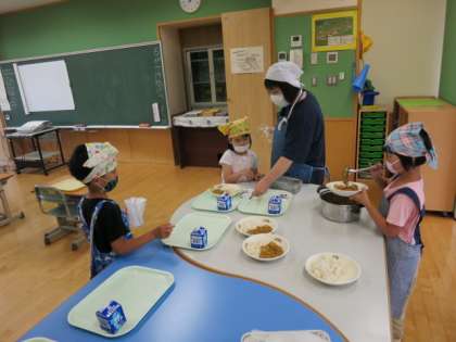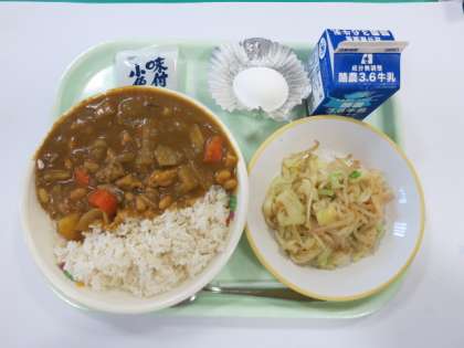 今日の献立は、かみかみカレー、ゆでたまご、きりぼし大根のサラダ、味付け小魚、です。