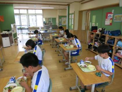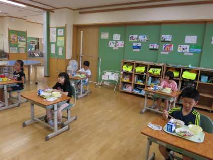 上学年は、午後からのプール清掃に備え、たくさん食べています。