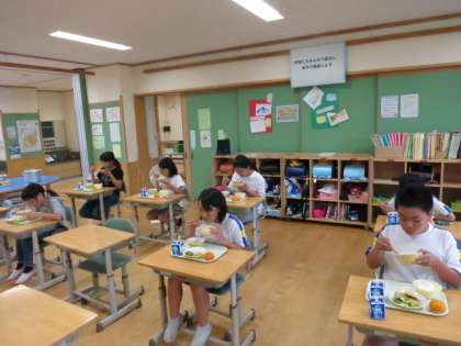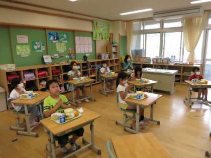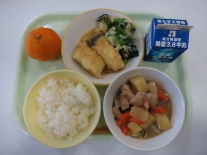 今日の献立は、魚のえごまみそかけ、こまつなひたし、とり肉とじゃがいものごま煮、れいとうみかん、です。