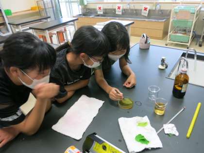 日光に当たっていたジャガイモの葉にデンプンができているか調べました。