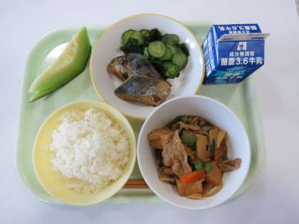 今日の献立は、あつあげのみそいため、さわらのゆうあん焼き、すのもの、メロン、です。