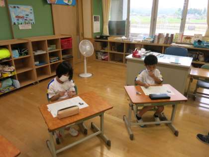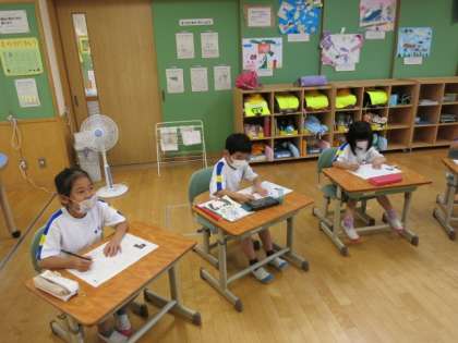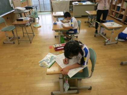 低学年 国語科 プリントやワークシートを書いていました。鉛筆の持ち方や文字を書く姿勢に気を付けています。