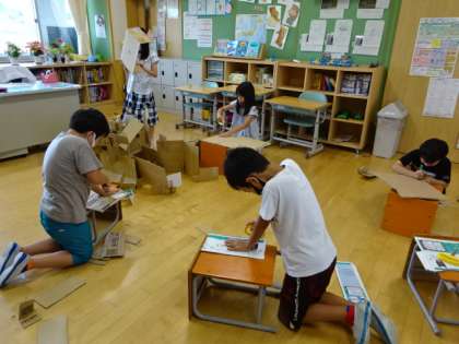 3年生は図工。段ボールカッターを使って段ボールを切り分け、切り込みを入れて組み合わせています。