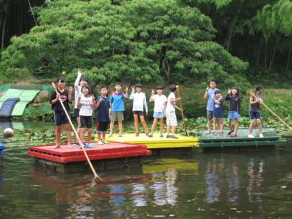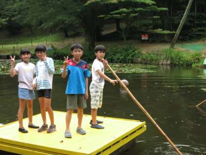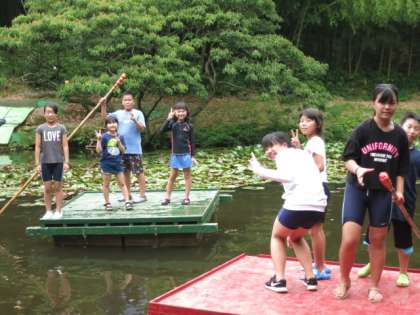 まずは、いかだに乗りました。バランスをとりながらいかだに乗り、竹竿1本で池の中を移動しました。