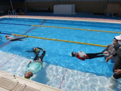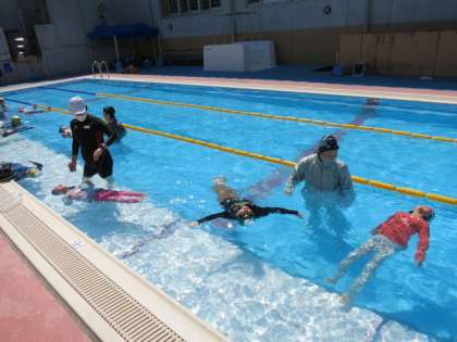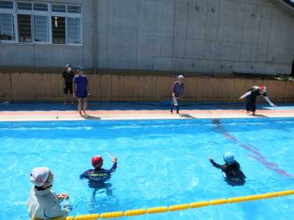 着衣泳教室2 公開日 2021/08/02 更新日 2021/08/02 学校風景 その後は、ペットボトルやボールなどを「浮き」の代わりにして、背浮きで浮く練習をしました。 1・2年生もみんな上手で講師の先生も驚いていました。