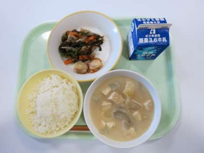今日の献立は、ほたてのこうみ焼き、もずくのチャプチェ、ごまけんちん、です。
