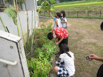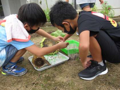 植物の観察をしていると、ヒマワリやホウセンカの種がなっているのを見付けました。