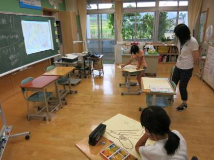 4年生 ヘチマの観察をしている様子を絵に表しています。