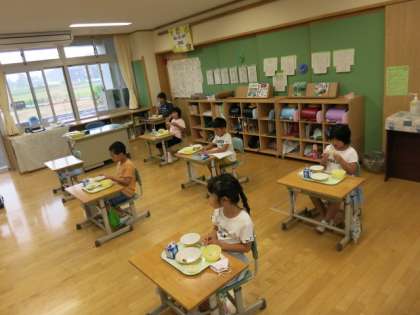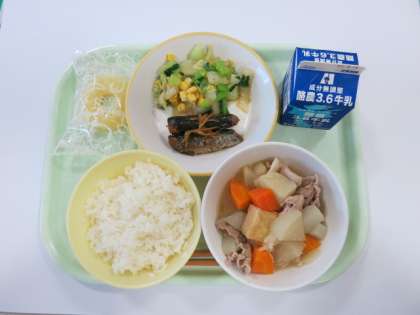 今日の献立は、いわしのしょうが味、コーン和え、だいこんのみそ煮込み、れいとうパイン、です。