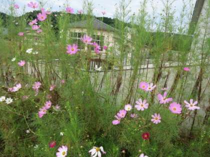 1学期に行った中央植物園でもらってきたコスモスの種が、花を咲かせ始めました。