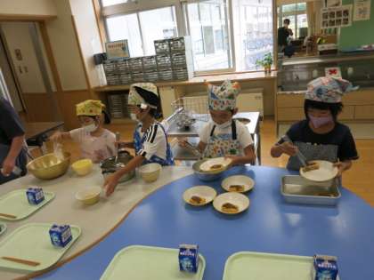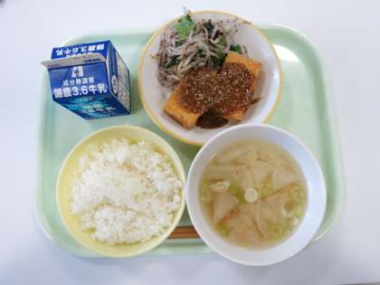 今日の献立は、あげだしどうふのごまだれかけ、ゆかり和え、みそ汁、です。