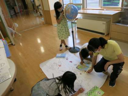 3年生、ちらしから、私たちが食べている食材がどこからやってきているか調べました。