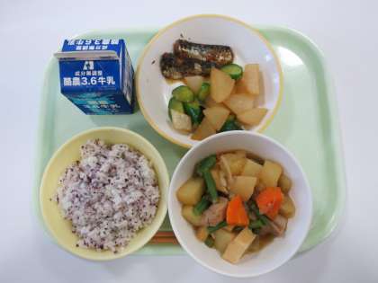 今日の献立は、ゆかりご飯、ぶた肉とじゃがいものうま煮、いわしのとさ煮、かふう和え、です。