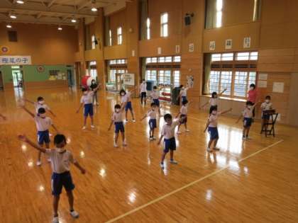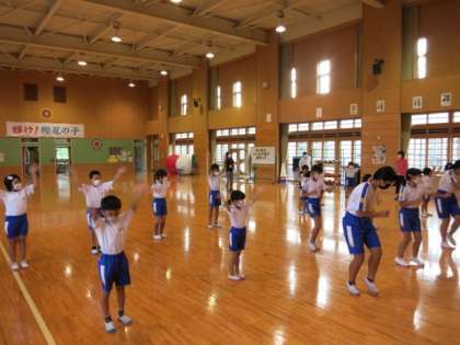 全校で応援練習をしました。高学年のダンスが格好よく決まっています。