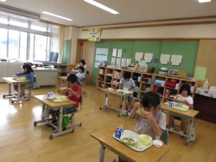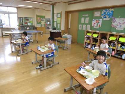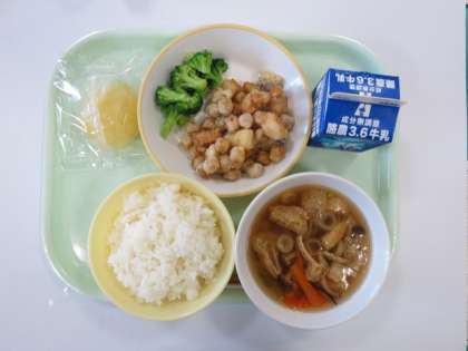 今日の献立は、さかなとひよこ豆のあまからめ、ゆでブロッコリー、すまし汁、れいとうりんご、です。