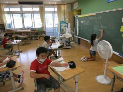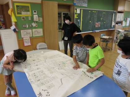 2年生 道徳 黒瀬谷のいいところを、まち探検で書いたふせんを見ながら振り返っています。