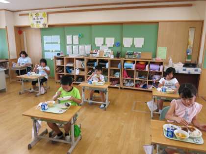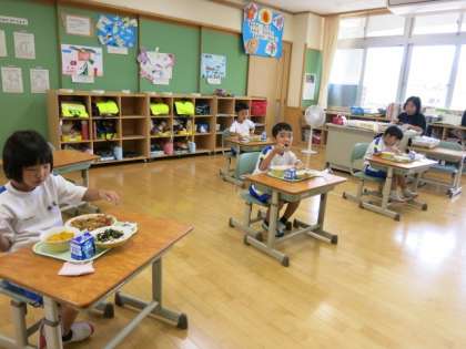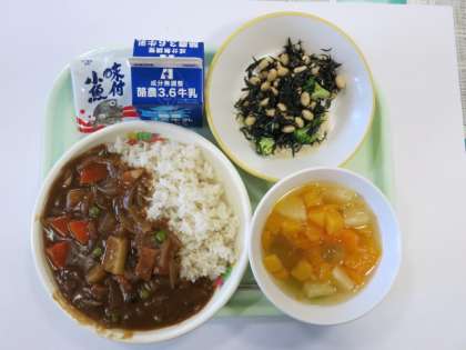 今日の献立は、むぎごはん、たべキリンハヤシ、大豆とひじきのサラダ、フルーツゼリーミックス、味付けこざかな、です。