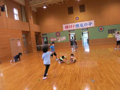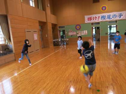 樫の子ホールでは、1年生から6年生まで男女混じってドッジボールをしていました。