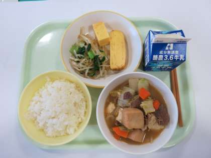 今日の献立は、すきやき、あつやきたまご、おひたし、です。