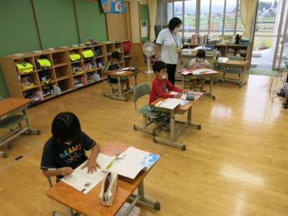 1年生 国語科 よい姿勢でワークシートを書いています。