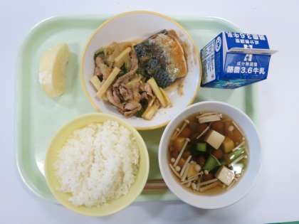 今日の献立は、さばのみそ煮、マコモタケのオイスターソースいため、きのこ汁、りんご、です。