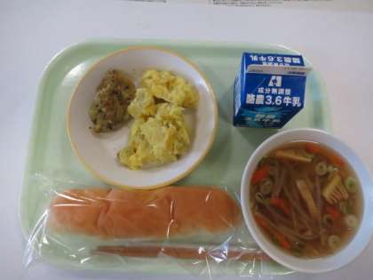 今日の献立は、こめこコッペパン、たらのこうそう焼き、チーズおさつ、はるさめスープ、です。
