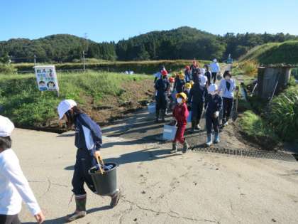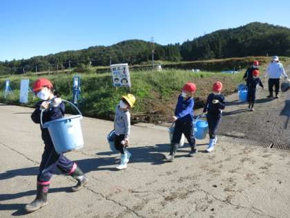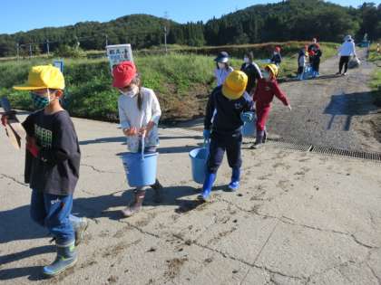 学校まで、みんなで手分けして運びました。重さで手がいたくなりました。