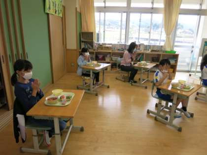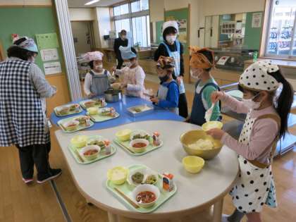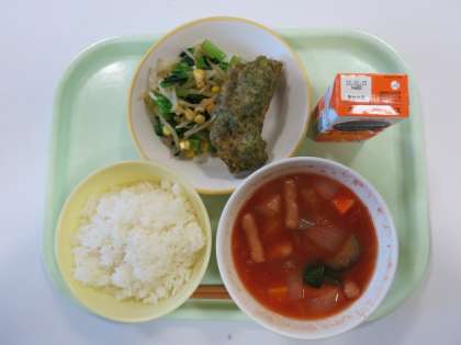 今日の献立は、魚のフリッター、コーン和え、豆とソーセージのトマト煮、オレンジジュース、です。