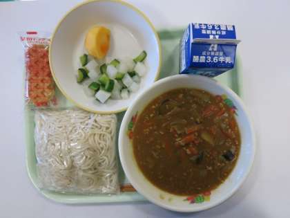 今日の献立は、ソフトめん、カレーソース、チーズドッグ、ころころサラダ、かき、です。