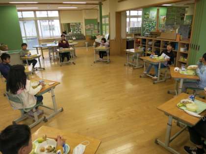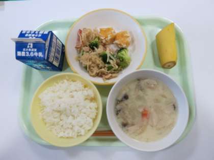 今日の献立は、にんじんシューマイ、きりぼしだいこんのペペロンチーノ、とうにゅうみそスープ、バナナ、です。