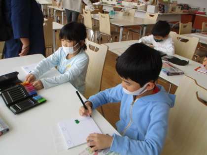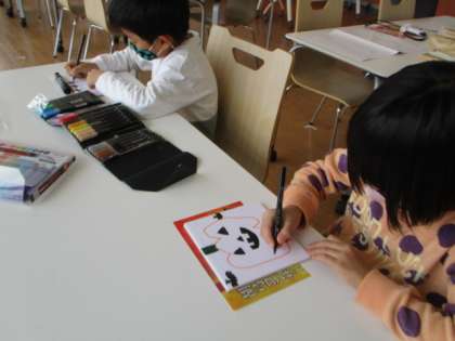 絵本館では、パズル作りもしました。台紙に好きなイラストや模様をかいて作りました。完成したら自分でパズルをして楽しんでいました。
