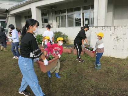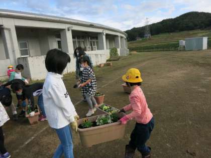 植えた後は、みんなで協力してプランターを移動しました。 寒さに負けないで、きれいな花を咲かせてくれるといいです。
