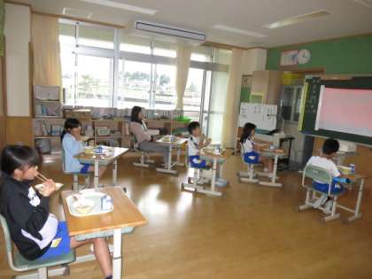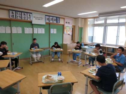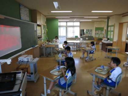 3・4年生は、学習発表会の発表の練習の様子を見ながら食べていました。