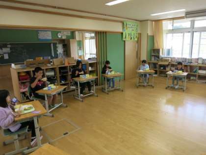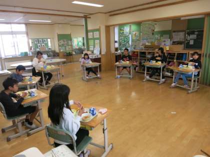 今日は、5年生が下学年の教室にそれぞれ行って会食しました。