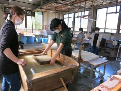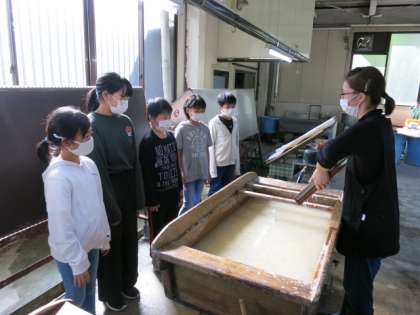 卒業証書づくり 紙すき体験 公開日 2021/10/29 更新日 2021/10/29 学校風景 6年生は、桂樹舎さんを訪れ、卒業証書づくりの紙すき体験を行いました。 よく知っている職員の方から、作業の手順を教わり、さっそく挑戦しました。