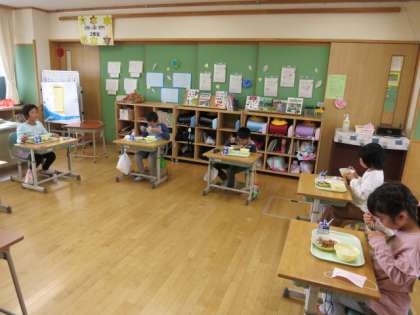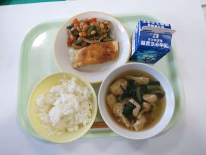 今日の献立は、あげざかなのレモン味、ごもく煮豆、うすくず汁、です。