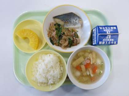 今日の献立は、さわらのしお焼き、しらたきのピリからいため、しらたま汁、カットパイン、です。