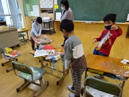 1年生の図工は「ひらひらゆれて」。針金ハンガーに透明ビニルシートを貼り、飾り付けました。どこに飾ったら風で揺れるかなと考えながら作っていました。