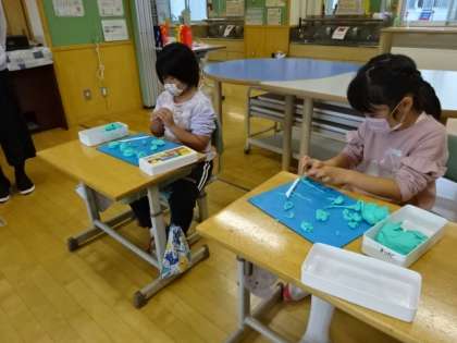 2年生の図工は「○○やさんをひらこう」。自分が開きたいお店を決め、その商品を粘土でつくりました。