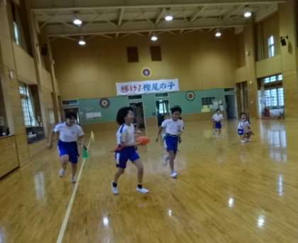上学年の体育は、4・6年生でタグラグビーをしました。時間いっぱい全力で戦い、試合後は、相手チームと気持ちよく挨拶を交わし、笑顔でエアタッチしていました。