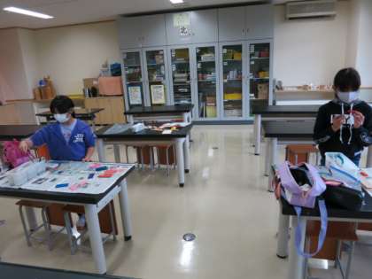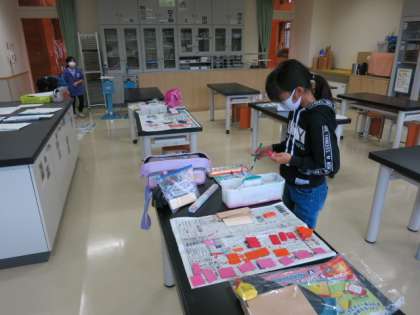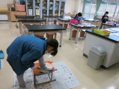 4年生も木の板をのこぎりで切って色をぬる作業をしていました。