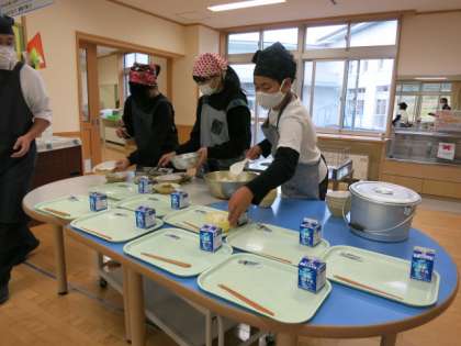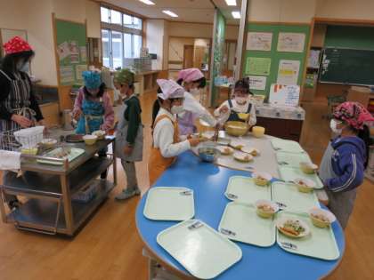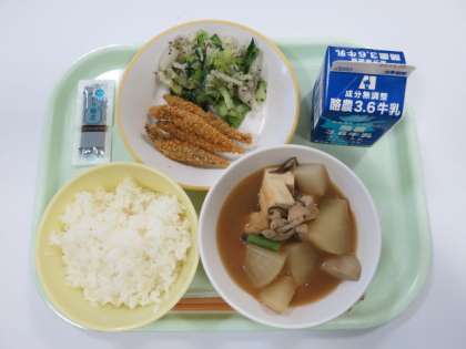 今日の献立は、さといもとあつあげのうま煮、きびなごのさくさくあげ、ばい肉和え、のりつくだ煮、です。