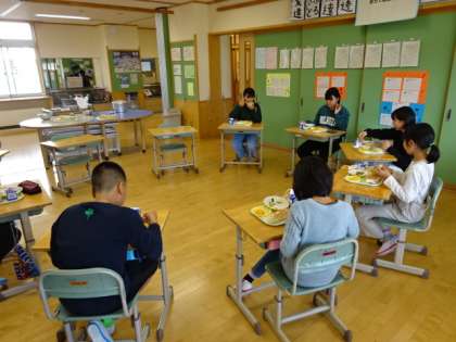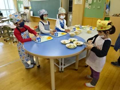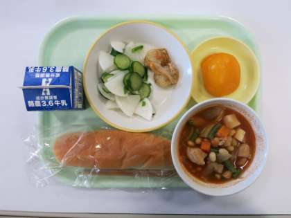 今日の献立は、ポークビーンズ、ほたてのこうみ焼き、かぶのサラダ、ももかん、です。
