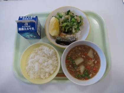 今日の献立は、さんまのしょうが味、じゃがいものそぼろあん、ゆかり和え、りんご、です。