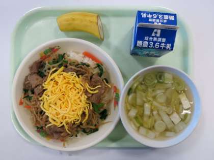 今日の献立は、ビビンバ(やき肉、ナムル、きんしたまご)、みそ汁、バナナ、です。