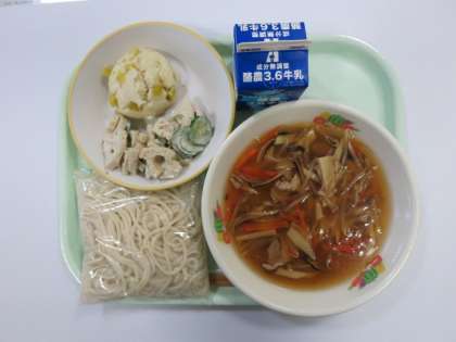 今日の献立は、ソフトめんの五目あんかけ、むしパン、れんこんサラダ、です。