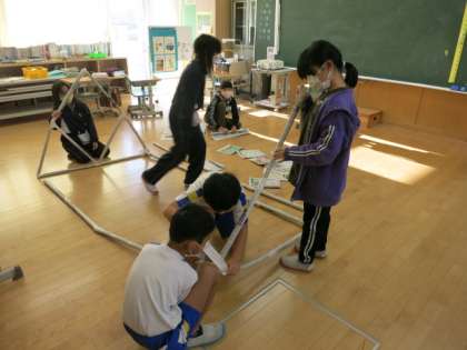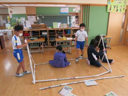 リユースとして、読み終わった新聞紙を丸めて、何かを作っていました。